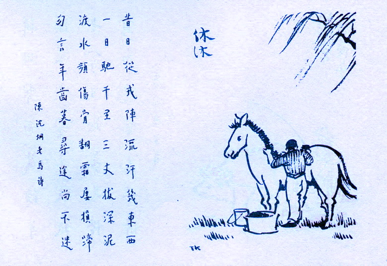 昔日从戎阵,流汗几东西,一日驰千里,三丈拔深泥。渡水频伤骨,翻霜屡损蹄,勿言年齿暮,寻途尚不迷。(陈 沈炯《老马诗》)