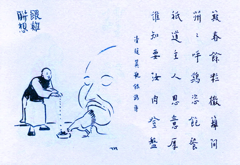 簸舂余粒撒篱间,喌喌呼鸡恣饱餐,只道主人恩意厚,谁知要汝肉登盘。(清 赵翼《观喂鸡诗》)