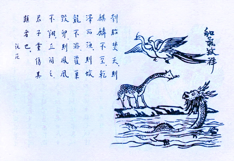 “刳胎焚夭,则麒麟不至;干泽而渔,则蛟龙不游;覆巢毁卵,则凤凰不翔。丘①闻之,君子重伤其类者也。”(《说苑》)①丘:孔子名丘,此为孔子之言。